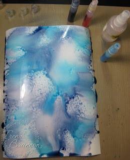 To make the background I spritzed a full sheet of cardstock with water, then spritzed a variety of colors- mini ministers filled with inks, Perfect Pearls and water - a recipe I learned from Tim Holtz . I picked up the cardstock and tilted it to make the colors blend. The ink colors I used are pretty in pink, night of navy and tempting turquoise. NOTE: The paper will curl up when it's wet. When you dry with heat tool, in a future step, it will flatten back out. Another tip I learned from Tim, use the heat gun on the front and back to dry it completely.